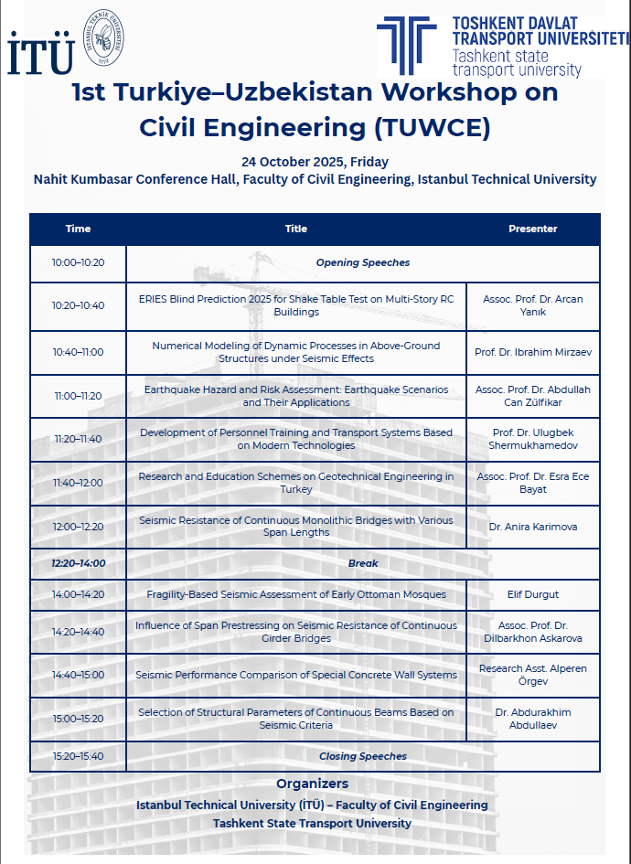 1st Turkiye–Uzbekistan Workshop on Civil Engineering (TUWCE), 24 Ekim Cuma günü İnşaat Fakültesi Prof. Dr. Nahit Kumbasar Konferans Salonu'nda gerçekleştirilecektir. Çalıştaya tüm akademik personelimiz ile lisans ve lisansüstü öğrencilerimiz davetlidir. Çalıştaya ait detaylı program aşağıda belirtilmektedir.